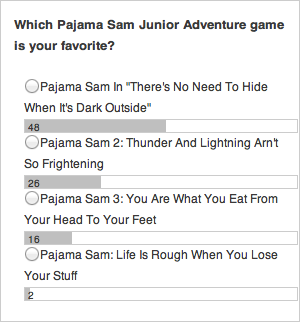 Pajama Sam's first game was the favorite among fans receiving 48 out of 92 votes.